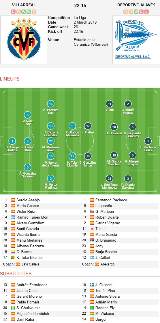 AEGoal.net cập nhật chính xác ĐỘI HÌNH RA SÂN trận Villarreal vs Alaves diễn ra lúc 22h15 ngày 02/3 trong khuôn khổ Vòng 27 giải VĐQG Tây Ban Nha, La Liga.