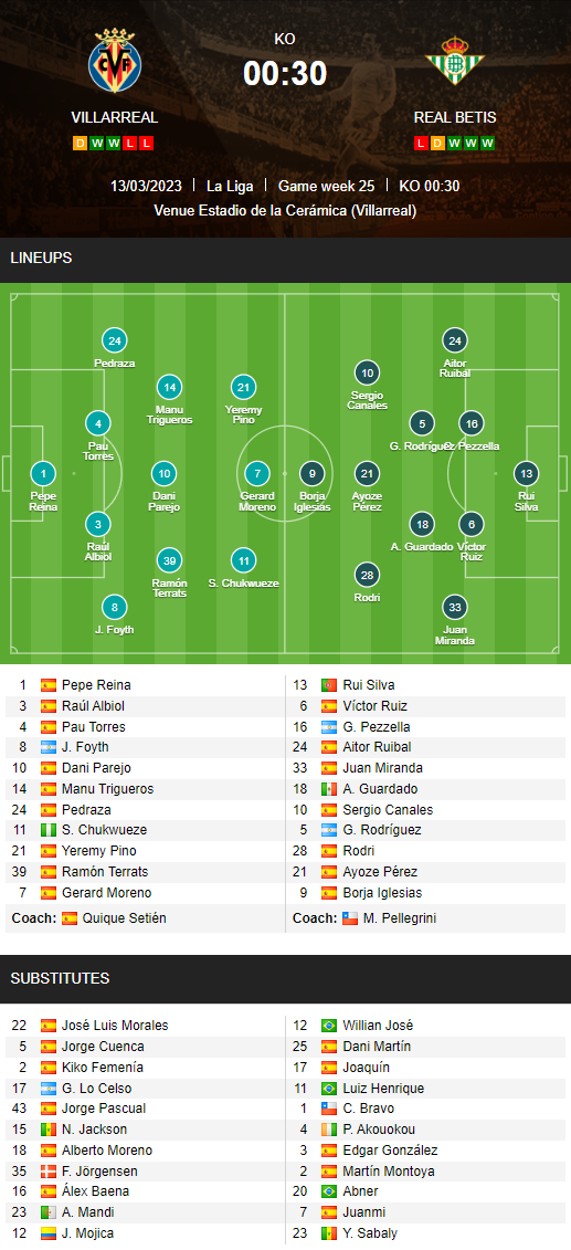 ĐỘI HÌNH RA SÂN trận Villarreal vs Betis, 00h30 ngày 13/03: VĐQG Tây Ban Nha