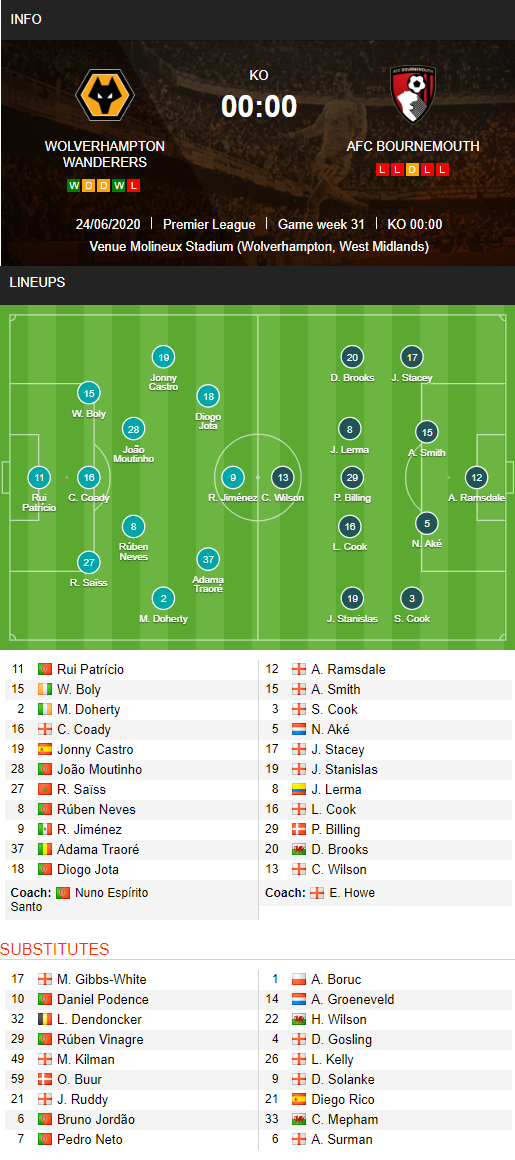 AEGoal.net cập nhật chính xác ĐỘI HÌNH RA SÂN trận Wolves vs Bournemouth diễn ra lúc 00h00 ngày 25/6 trong khuôn khổ giải Ngoại hạng Anh.