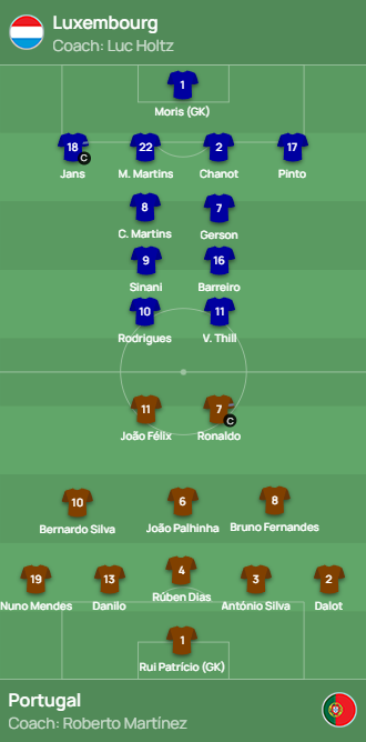 Luxembourg: Moris; Bohnert, Chanot, Gerson, Pinto; Sinani, Barreiro, Pereira, Olesen, Sanches; Rodrigues