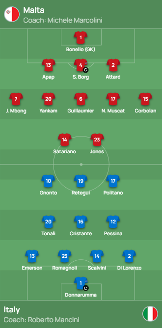 Italia: Donnarumma; Di Lorenzo, Scalvini, Romagnoli, Spinazzola; Cristante, Verratti, Tonali; Politano, Retegui, Gnonto.
