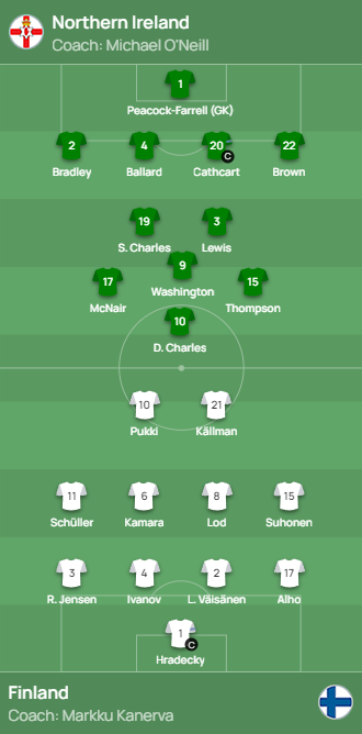 Bắc Ireland: Peacock-Farrell; Ballard, Cathcart, Brown; Bradley, McNair, S. Charles, Saville, Lewis; Magennis, D. Charles