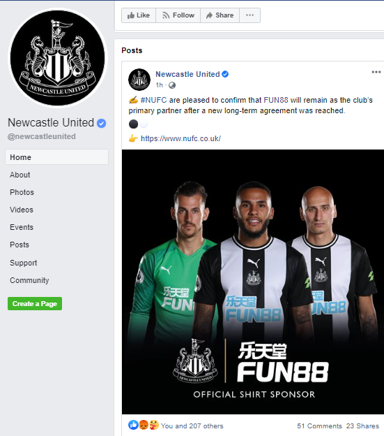 FUN88 là đối tác tài trợ của Newcastle United từ năm 2017. Đây từng được xem là thương vụ có giá trị tài trợ lớn nhất trong lịch sử của CLB. Với việc tiếp tục đồng hành cùng nhau, logo FUN88 sẽ vẫn xuất hiện trên áo đấu của Chích Chòe trong ba mùa giải tới.
