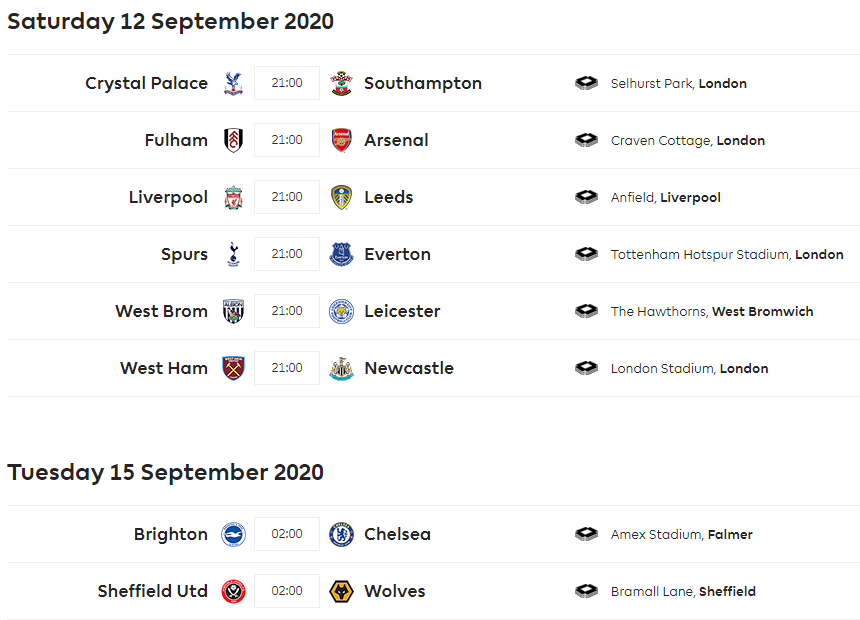 Như vậy là giải ngoại hạng Anh đã có lịch thi đấu của mùa giải mới. Ở vòng đấu thứ nhất này sẽ chỉ có 8 trận đấu được diễn ra với 6 trận đấu ngày thứ 7 (12/9) và 2 trận đấu muộn ở khung giờ rạng sáng ngày thứ 3 (15/9). Hai cặp đấu Burnley vs Manchester Utd và Manchester City vs Aston Villa sẽ được lùi thời gian thi đấu do Man Utd vs Man City chưa được nghỉ đủ 30 ngày kể từ trận đấu cuối cùng họ tham dự tại cúp châu Âu.