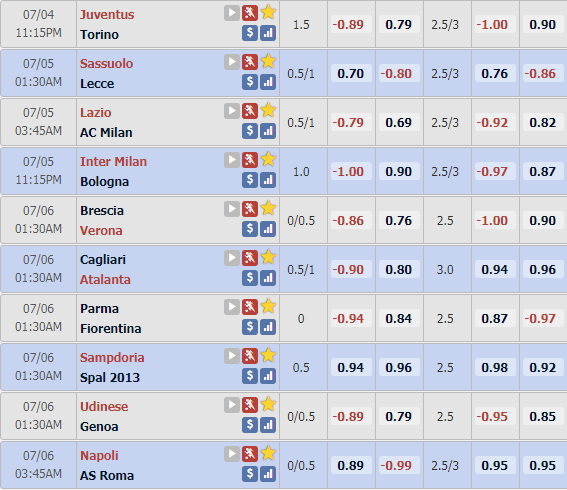 Tỷ lệ châu Á vòng 29 giải VĐQG Italia - Serie A