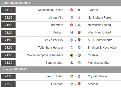Cùng AEGoal điểm qua lịch thi đấu và tỷ lệ ở vòng 30 của giải Ngoại hạng Anh mùa 2022/2023 diễn ra cuối tuần này.