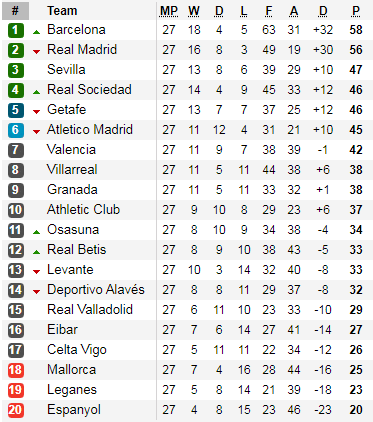 La Liga cũng sẽ trở lại vào cuối tuần này với vòng đấu thứ 28, trận đấu sớm nhất của vòng đấu là cuộc đối đầu giữa đội chủ nhà Sevilla và Real Betis được diễn ra vào rạng sáng ngày thứ 6. Ở thời điểm hiện tại Barcelona đang là đội chiếm ngôi đầu BXH với 58 điểm sau 27 vòng đấu, Real Madrid đứng ngay sau với 2 điểm ít hơn. Cuộc cạnh tranh ngôi vô địch giữa Barca và Real Madrid vẫn còn rất hấp dẫn khi giải đấu vẫn còn tới 11 vòng đấu.