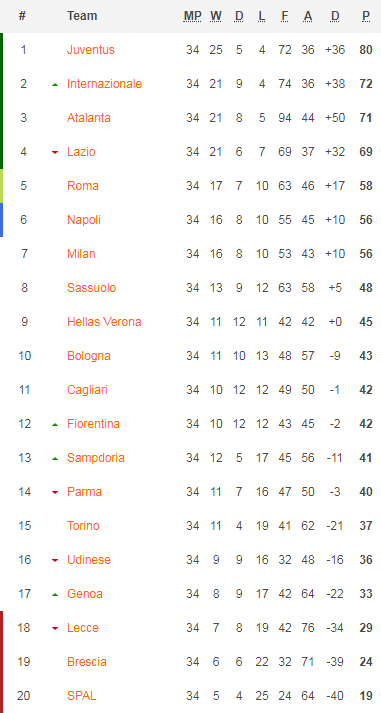 Ở nhóm cuối bảng xếp hạng SPAL đã chắc suất xuống hạng mùa tới, 2 đội còn lại đang ở vị trí xuống hạng là Brescia và Lecce vẫn còn cơ hội trụ khi giải đấu vẫn còn tới 4 vòng đấu nữa. Với khoảng cách 4 điểm so với nhóm trụ hạng Lecce vẫn còn rất nhiều cơ hội, Brescia có ít khả năng hơn khi đang kém nhóm thoát hiểm tới 9 điểm, về lý thuyết Brescia vẫn còn cơ hội nhưng xét trên thực tế thì rất khó để họ có thể vượt qua hoàn cảnh hiện tại.