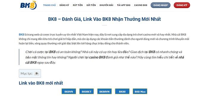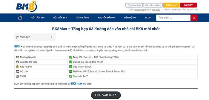 Website cung cấp đường dẫn vào nhà cái BK8 - bk8vnmobi.com được đánh giá là một website uy tín, quen thuộc đối với những anh em đam mê cá độ. Tại địa chỉ website cung cấp cho người chơi danh sách đường dẫn chính thống vào nhà cái BK8. Đồng thời liên tục update các link dự phòng để trong trường hợp link chính thống bị chặn, người chơi có thể link hoạt sử dụng các bản link dự phòng để vào nhà cái BK8 nhanh chóng mà không mất nhiều công sức tìm kiếm.