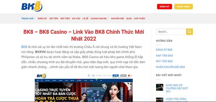 Website có giao diện vô cùng thân thiện với người sử dụng, bố cục các thanh công cụ được sắp xếp dễ nhìn, màu sắc font chữ gần giống với nhà cái chính thức BK8. Các thắc mắc của anh em về nhà cái BK8 đều được giải đáp một cách chi tiết nhất. Bên cạnh đó là hướng dẫn đăng ký, nạp tiền, rút tiền, khuyến mại, thư viện cung cấp kinh nghiệm cá cược được chia sẻ từ những cao thủ lâu năm vô cùng phong phú.