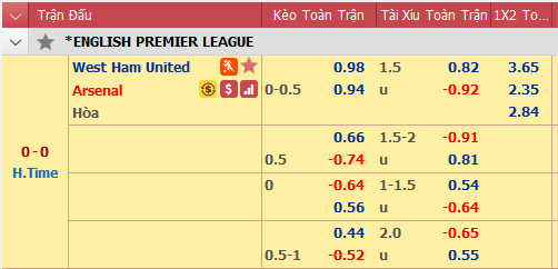 Kết quả West Ham 1-0 Arsenal (hiệp 1: 0-0)