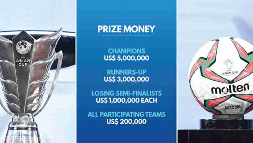 Theo đó, đội vô địch Asian Cup 2019 nhận thưởng 5 triệu USD, á quân 3 triệu USD, hai đội thua bán kết nhận mỗi đội 1 triệu USD. AFC cũng chia đều cho tất cả 24 đội vào VCK mỗi đội 200.000 USD.