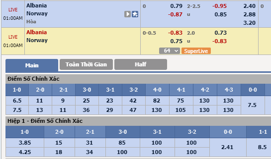 Kèo hiệp 1: Cả Albania và Na Uy đều là những đội bóng rất lười ghi bàn trong Hiệp 1. Thống kê đã chỉ ra 9/10 trận gần nhất Albania không ghi bàn ở Hiệp đấu thứ nhất, 8/10 trận của Na Uy cũng cho kết quả tương tự. Tuy nhiên rất có thể việc hai đội gặp nhau sẽ là cơ hội để cả hai thay đổi thành tích đáng buồn này khi tính chất trận đấu này chỉ là một trận giao hữu. 5/8 trận giao hữu sân nhà gần nhất, Albania có bàn thắng trong Hiệp 1. Do đó với kèo hòa được thua ở Hiệp 1 và tài/xỉu 3/4, chọn Albania và tài, người chơi có nhiều cơ hội thắng kèo.