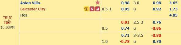 Hành quân đến Villa Park trong ngày hôm nay, Leicester được giới cầm cân nảy mực đánh giá cao với kèo chấp 3/4. Về cơ bản, với vị thế của đôi bên lúc này thì mức chấp đó của Leicester chưa phải là cao nhưng nếu so với quá khứ thì đây là bước đột phá của Leicester. Trong lịch sử, tỷ lệ cao nhất mà Leicester sở hữu khi làm khách tại Villa Park chỉ là chấp đồng banh.