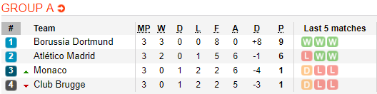 (Nhận định bóng đá) – Bảng A Cúp C1 châu Âu năm nay tưởng chừng sẽ cân bằng và có sự cạnh tranh khốc liệt nhưng mọi chuyện lại khác hoàn toàn. Dortmund chơi bùng nổ để độc chiếm ngôi đầu với 3 trận toàn thắng trong khi Monaco là nỗi thất vọng vô bờ bến. Thậm chí cục diện bảng đấu này sẽ sớm ngã ngũ ngay sau lượt trận này trong trường hợp Atletico thắng và trận còn lại hòa.