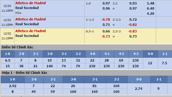 Nếu nhìn trên bề nổi, Atletico Madrid chấp 1 hòa là lựa chọn mang lại đáng kể điểm tựa cho nhà đầu tư châu Á. Bởi thực tế đội bóng của HLV Simeone đang thi đấu ổn định với mạch 12 trận liên tiếp bất bại gần đây, trong đó có 5 chiến thắng kèo gần nhất. Ngược lại, Sociedad thậm chí vừa thua cả đội nghiệp dư Lleida dù được chơi trên sân nhà tại Cúp Nhà Vua. Nhưng tất nhiên, La Liga là đấu trường hoàn toàn khác so với mặt trận Cúp vốn chứng kiến động lực thi đấu thiếu quyết tâm của nhiều đội bóng lớn.