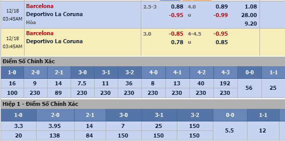 Tổng bàn thắng: Có những thời điểm Barcelona giành chiến thắng dễ dàng nhưng không ít lần Deportivo lại khiến đại diện xứ Catalan phải rượt đuổi tỷ số. Do đó, cả 6 trận đối đầu gần nhất giữa hai đội đều khép lại với ít nhất 3 bàn thắng được ghi. Thực tế, các nhà cái đã niêm yết tổng bàn thắng cả trận lên tới mức 4 hòa đủ cho thấy họ đang có phần tin tưởng hơn vào kịch bản tưng bừng bàn thắng.