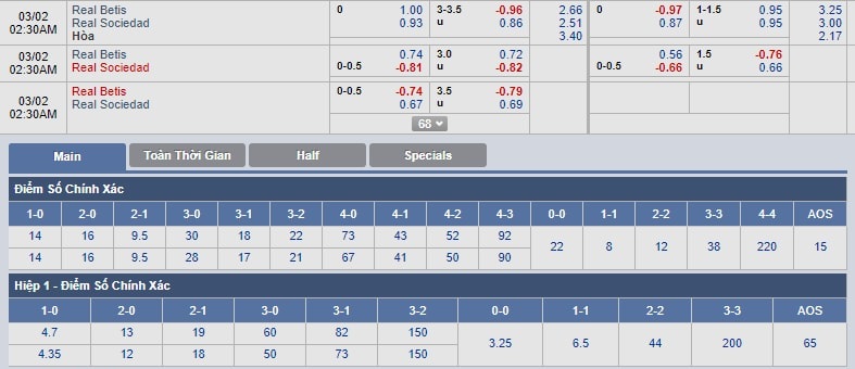 Phạt góc: Trong điều kiện gặp nhiều bất lợi, Sociedad nhiều khả năng phải chờ đến những tình huống cố định để tạo ra sự khác biệt. Phạt góc vì thế có thể phát sinh số lượng lớn, nhất là khi đội khách đang xếp thứ 2 về chỉ số này từ đầu mùa với trung bình 6.60 quả mỗi trận. Trong khi đó, Betis lại là đội chống phạt góc kém nhất giải khi trung bình mỗi trận hứng chịu 5.88 từ đầu mùa. Chọn Trên phạt góc cả trận.