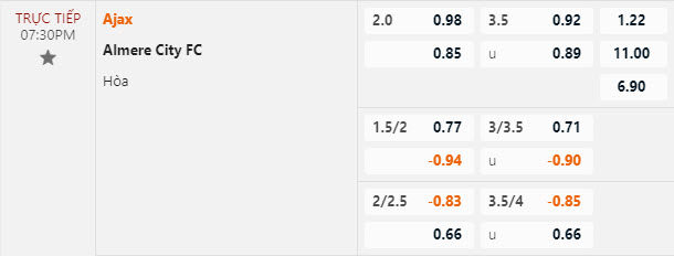 Ajax thua kèo cả 3 trận đối đầu vừa qua trước Almere City. Ajax thua kèo tới 3/5 trận đấu mới đây tại giải VĐQG Hà Lan. Almere City thắng kèo tới 5/8 trận đấu gần nhất tại giải đấu số 1 Hà Lan.