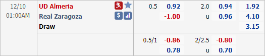Riêng tại Juegos Mediterraneos của Almeria, vị khách đến từ Aragon cũng đã để thua tới 2 và chỉ hoà 1 ở 3 lần viếng thăm vừa rồi, vì vậy tình hình lại càng trở nên khó khăn với đội bóng này và đồng nghĩa là niềm tin chiến thắng lại càng được củng cố cho đội chủ nhà. Tuy nhiên đã có vấn đề phát sinh trên sàn giao dịch châu Á khi nhà cái chỉ xếp Almeria ở kèo -1/2.