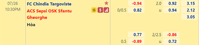 Sàn giao dịch châu Á ở trận đấu này ghi nhận mức kèo Sepsi chấp 0:1/4. Đây cũng là tỷ lệ đã xuất hiện ở lần gần nhất họ làm khách tới sân của Chindia Targoviste và ca khúc khải hoàn với chiến thắng 2-1. Với phong độ thăng hoa thời gian qua, chuyên gia soi kèo tin vào một thắng lợi dành cho Sepsi.