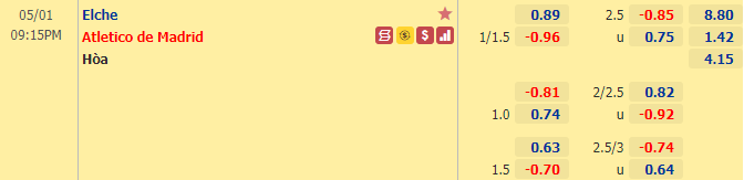 Cả 3 trận đối đầu trước đây giữa hai đội trên sân của Elche khép lại với chỉ tối đa 2 bàn/trận. 6/7 trận gần đây của Elche kết thúc với kịch bản tương tự. 6/7 trận vừa qua của Atletico Madrid trên sân khách cũng kết thúc mà không thể vượt mốc 2,5 bàn thắng. Cùng mức kèo Tài Xỉu 2 1/2 đã đổi sang mức 2 1/4 vào chiều 30/4, khả năng nổ Tài trong 90 phút sắp tới sớm bị nghi ngờ.