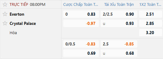 Đêm nay, đội bóng tới từ London không có quá nhiều mất mát về nhân sự và thêm phong độ ổn định, họ tự tin chấm dứt chuỗi 9 trận đối đầu không thắng trước Everton. Nhấn mạnh, Crystal Palace đang có thăng hoa toàn thắng 3 trận đấu mới đây và nổi bật là hạ gục đương kim vô địch Liverpool ở lượt trận gần nhất của giải Ngoại hạng Anh. Trái lại, đội chủ nhà Everton vừa có chuỗi 5 trận đấu liên tiếp không biết mùi thắng lợi và khiến giới chuyên môn dè chừng khi đặt niềm tin.