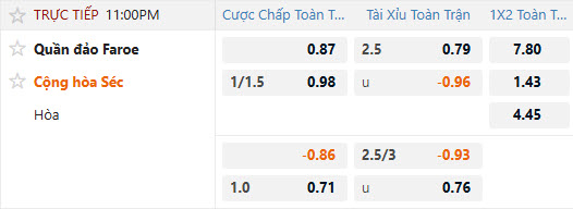 Faroe Islands thắng kèo cả 2 trận đấu mới đây chạm mặt Séc. Faroe Islands bất bại kèo tới 10/11 trận đấu vừa rồi tại mọi đấu trường. Séc không thắng kèo tới 4 lần trong số 5 trận đấu vừa rồi phải chấp với cược hơn 1 trái.
