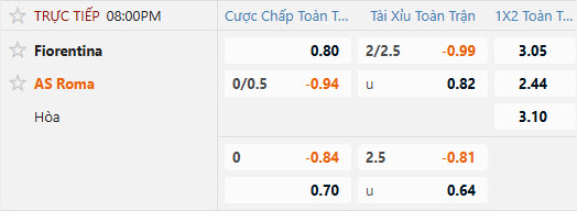 Tỷ lệ kèo Fiorentina vs AS Roma