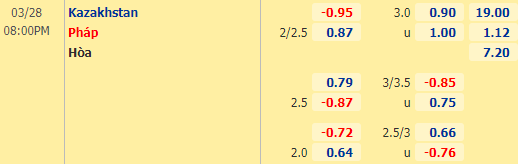 Với thực lực như vậy của Kazakhstan, hẳn nhiều người sẽ nghĩ đến chiến thắng dễ dàng cho Pháp. Tuy nhiên thì cá nhân tôi không đánh giá cao kèo chấp 2 1/4 dành cho các vị khách trận này. Đáng nói hơn là mức handicap đó xuất hiện trong bối cảnh tài xỉu chỉ là 3 hòa thì không dễ cho cửa trên có thể thắng đậm.