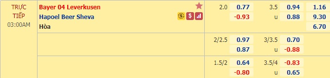 Trận lượt đi dù phải làm khách nhưng Leverkusen vẫn có chiến thắng tưng bừng 4-2, trong trận đấu mà họ chấp kèo tới 0:1 1/2. Chính vì thế, ở trận tái đấu này việc nhà cái đẩy tỷ lệ lên mức 0:2 1/4 không khiến nhiều người bất ngờ. Với phong độ ghi bàn thăng hoa của hàng công, người viết đánh giá cao khả năng sẽ có thêm một chiến thắng cách biệt nữa dành cho đại diện Bundesliga trước một H. Beer Sheva đang sa sút với 6 trận liên tiếp chỉ hòa và thua.