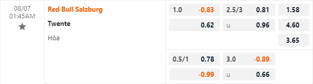Được thi đấu trận lượt đi trên sân nhà nên Red Bull Salzburg vẫn được đánh giá là đội cửa trên với kèo chấp đang là -3/4. Ở mùa giải trước Red Bull Salzburg cũng đã tham dự vòng bảng cúp C1 châu Âu nhưng thành tích là khá tệ khi chỉ thắng 1, hòa 1 và để thua 4 sau 6 lượt trận. Thế nhưng với FC Twente, đây mới chỉ là lần quay lại đấu trường danh giá nhất châu Âu sau hơn chục năm vắng bóng.