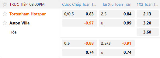 Tỷ lệ kèo Tottenham vs Aston Villa