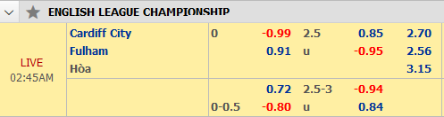 Với kèo tổng bàn thắng cả trận, các chuyên gia hứa hẹn đây sẽ là bữa tiệc bàn thắng khi chỉ số này đang được kéo lên mốc mới 2 3/4. Nhìn vào kết quả đối đầu với 6 trong 8 trận gần nhất đều xuất hiện từ 3 bàn trở lên và cả 3 trận sân nhà của Cardiff từ đầu mùa đều khép lại với kịch bản tương tự là những điểm tựa đáng hy vọng.