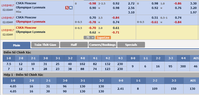 Tổng bàn thắng cả trận: Dự đoán sẽ là 90 phút tẻ nhạt trên sân của CSKA Moscow khi đây mới là trận lượt về và cả 2 đội đều thi đấu thận trọng. Lợi thế sân bãi đem về cho chủ nhà cơ hội chiến thắng cao hơn. Khi lựa chọn trên TTCA gặp khó khăn, một "cửa" đầu tư khác mà chuyên gia khuyên NHM nên cân nhắc là tổng số bàn thắng: dưới 2 1/4 bàn.
