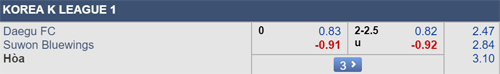 (Nhận định bóng đá) - Sau 22 vòng đấu, Daegu có 33 điểm, hiện đang đứng thứ 5 ở giải VĐQG Hàn Quốc. Ở loạt trận vòng 23 chiều nay, thầy trò Andre được trở về sân nhà tiếp đón Suwon Bluewings, đội bóng đang đứng ngay phía dưới với 29 điểm. Khởi đầu tốt hơn và có ưu thế sân bãi nhưng Daegu chỉ được nhà cái xếp ngang cơ đối thủ với tỷ lệ 0:0.