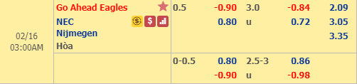 Với những thông tin kể trên, cùng với việc được thi đấu trên sân nhà, Go Ahead rõ ràng rất hứa hẹn sẽ giành chiến thắng trong 90 phút tranh tài sắp tới. Tuy nhiên, người hâm mộ rõ ràng phải cân nhắc với quyết định đặt niềm tin vào chủ nhà khi kèo châu Á cả trận chỉ là -1/2. Trong vòng hai ngày qua, điểm ăn cửa NEC Nijmegen liên tục biến động theo hướng giảm và đến sáng 14/2, kèo chính -1/2 và kèo phụ -1/4 đã có thể đổi chỗ cho nhau.