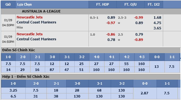Tổng bàn thắng cả trận: Newcastle Jets đang gặp khá nhiều vấn đề ở thời điểm hiện tại. Đội chủ nhà đều chịu tổn thất ở cả hàng thủ lẫn tuyến tiền đạo nên họ không phải địa chỉ đáng tin cậy để hy vọng vào những bàn thắng. Bên phía đối diện, Central Coast chỉ ghi được 1 bàn trong 5 trận gần nhất. Hơn nữa, cả 5 lần đối đầu gần nhất trên sân của Newcastle Jets gần đây đều khép lại với tối đa 2 bàn thắng. Chọn Dưới 2 3/4 bàn cả trận.