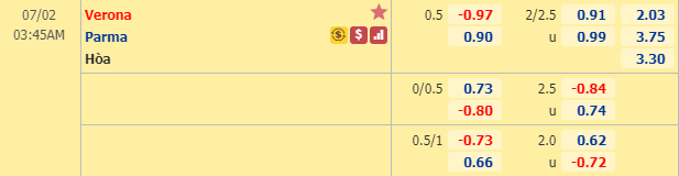 Việc nhà cái để Verona chấp -1/2 theo kèo châu Á sớm cho thấy chủ nhà là kênh đầu tư sáng nước. Bởi lẽ ba lần tiếp đón Parma trước đây trên sân nhà, Verona chỉ chấp -1/4 theo chỉ số tương tự. Có một thực tế vẫn đang tồn tại là Parma luôn không còn là chính mình khi đối đầu Verona.