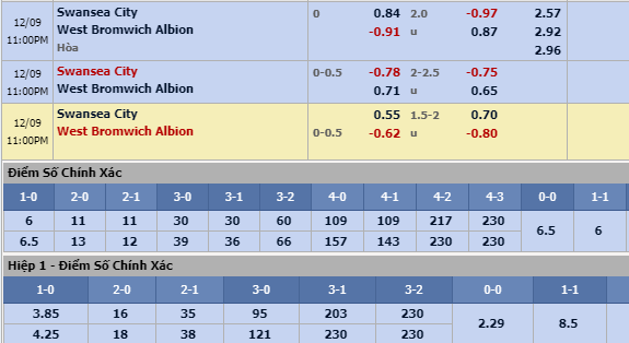 Trong hoàn cảnh như vậy, yếu tố sân nhà được coi là điểm tựa đáng kể cho Swansea có thể nghĩ đến kết quả khả quan. Nhưng dường như các nhà cái châu Á lại không đánh giá cao lợi thế này khi niêm yết kèo trên sàn giao dịch chỉ dừng lại với mốc chính 0:0. Tỷ lệ này rõ ràng mang chiều hướng tích cực hơn dành cho West Brom khi đội khách đang có sự tiến bộ trông thấy.