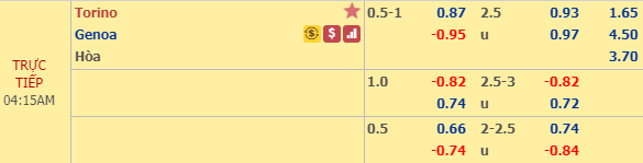 Nhìn xa hơn, trong 7 lần mới đây ghé thăm sân của Torino, Genoa đều không thắng (hòa 3, thua 4). Nhà cái cũng đánh giá thấp Genoa trong cuộc chiến ngày hôm nay khi ra tỷ lệ khách được chấp 3/4. Lưu ý rằng khi đôi bên đụng độ tại sân của Torino, trong 3 trận gần nhất mà chủ nhà chấp 3/4, họ đều đánh bại các vị khách.