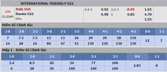Tổng bàn thắng cả trận: Không giống như đội tuyển lớn, các cầu thủ U21 Italia thường nhập cuộc rất cởi mở và tổ chức đội hình dâng cao chủ động áp đặt thế trận hơn là sự rụt rè. Điều này dẫn đến các trận đấu của U21 Italia trở nên đáng xem hơn với liên tiếp 6 trận gần đây đều có ít nhất 3 bàn thắng được ghi. U21 Nga cũng không mạng trong phòng ngự nhưng đạt hiệu quả khá cao trên hàng công với 5/7 trận gần nhất đều khép lại với tối thiểu 3 bàn thắng. Chọn Trên 2 3/4 bàn cả trận