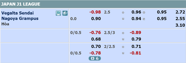 Tuy vậy, với điểm tựa sân nhà, Vegalta Sendai vẫn được giới chuyên môn đánh giá cao ở trận đấu trưa nay. Nên nhớ, ở mùa giải trước, khi tiếp đón Nagoya Grampus, Vegalta Sendai từng bị xếp ở chiếu dưới với tỷ lệ 1/2:0. Sự thay đổi về kèo chấp có thể xem là tín hiệu đáng mừng với đoàn quân của HLV Takashi Kiyama.