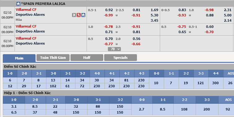 Trên thực tế, các nhà cái đã thể hiện quan điểm thiếu tích cực với Villarreal khi chỉ niêm yết kèo chính trên sàn giao dịch ở mức chấp 3/4. Đây là tỷ lệ thấp hơn đáng kể so với 2 lần tiếp đón Alaves gần nhất đều chứng kiến Villarreal chấp 1 hòa. Rõ ràng, đây không phải thời điểm để tin tưởng vào đội chủ nhà.