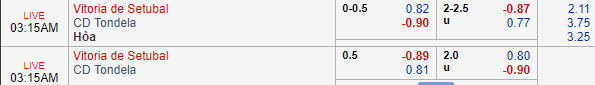 Với vị thế như vậy của 2 đội, cộng thêm điều kiện sân bãi nên việc Vitoria Setubal ở cửa trên trận này là điều dễ hiểu. Kèo chấp đồng banh của họ đang có xu hướng nhích lên mức chủ chấp hòa, đây là tín hiệu vô cùng tích cực với Setubal. Mùa trước, Vitoria Setubal chơi không tốt trên sân nhà nhưng năm nay mọi thứ có vẻ sẽ thay đổi.