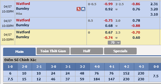 Tổng bàn thắng cả trận: Khả năng Burnley bị thủng lưới không nhiều khi họ thuộc nhóm 4 đội có hàng thủ chắc chắn nhất giải ở thời điểm hiện tại. Nhưng ở chiều ngược lại, sau nhiều sai lầm dưới hàng hậu vệ, Watford buộc phải có biện pháp gia cố nhằm cải thiện tình hình. Trong hoàn cảnh như vậy, kịch bản tưng bừng bàn thắng khó xảy ra. Chọn Dưới 2 1/4 bàn cả trận.