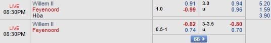 Kèo châu Á ở trận này được nhà cái niêm yết trên sàn giao dịch là 0:3/4, nhưng đến thời điểm hiện tại đã được đẩy lên thành 0:1 với điểm ăn khá cân bằng nhau. Mức kèo 0:3/4 cũng bằng với chuyến làm khách gần nhất của Feyenoord tới sân của Wiliem II hồi tháng 4 vừa qua. Khi đó, Feyenoord có chiến thắng tưng bừng 5-1. Tính ra, đội khách đang áp đảo về lịch sử đối đầu với 6 trận gần nhất toàn thắng và kịch bản này hoàn toàn có thể tái diễn ở trận đấu tối nay.