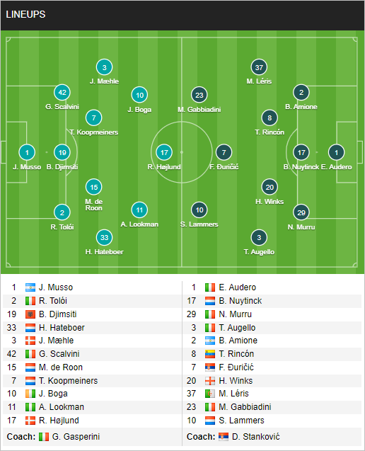 Atalanta: Musso; Toloi, Demiral, Scalvini; Hateboer, De Roon, Koopmeiners, Maehle; Boga, Lookman; Hojlund