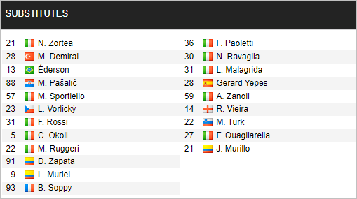 Sampdoria: Audero; Murillo, Nuytinck, Amione; Leris, Rincon, Winks, Augello; Djuricic; Lammers, Gabbiadini