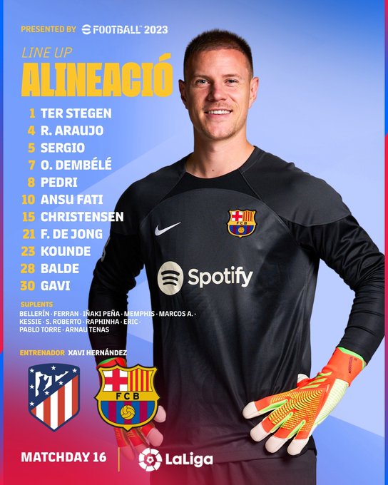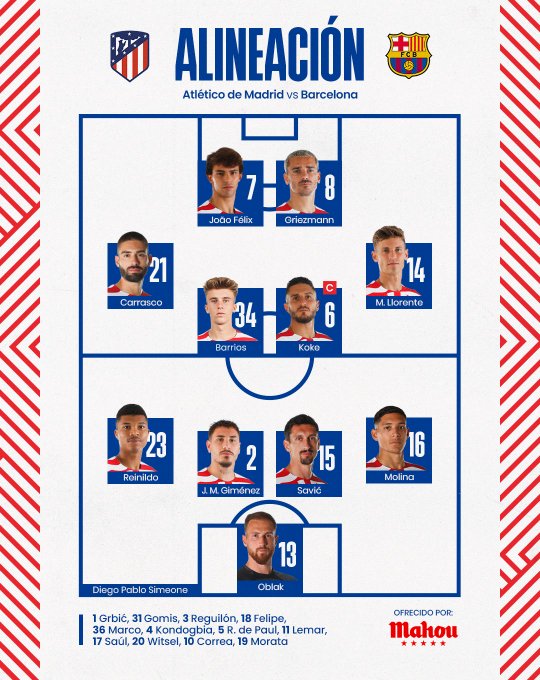 AEGoal cập nhật chính xác ĐỘI HÌNH RA SÂN trận Atletico Madrid vs Barcelona diễn ra lúc 03h00 ngày 09/01/2023 trong khuôn khổ giải VĐQG Tây Ban Nha.